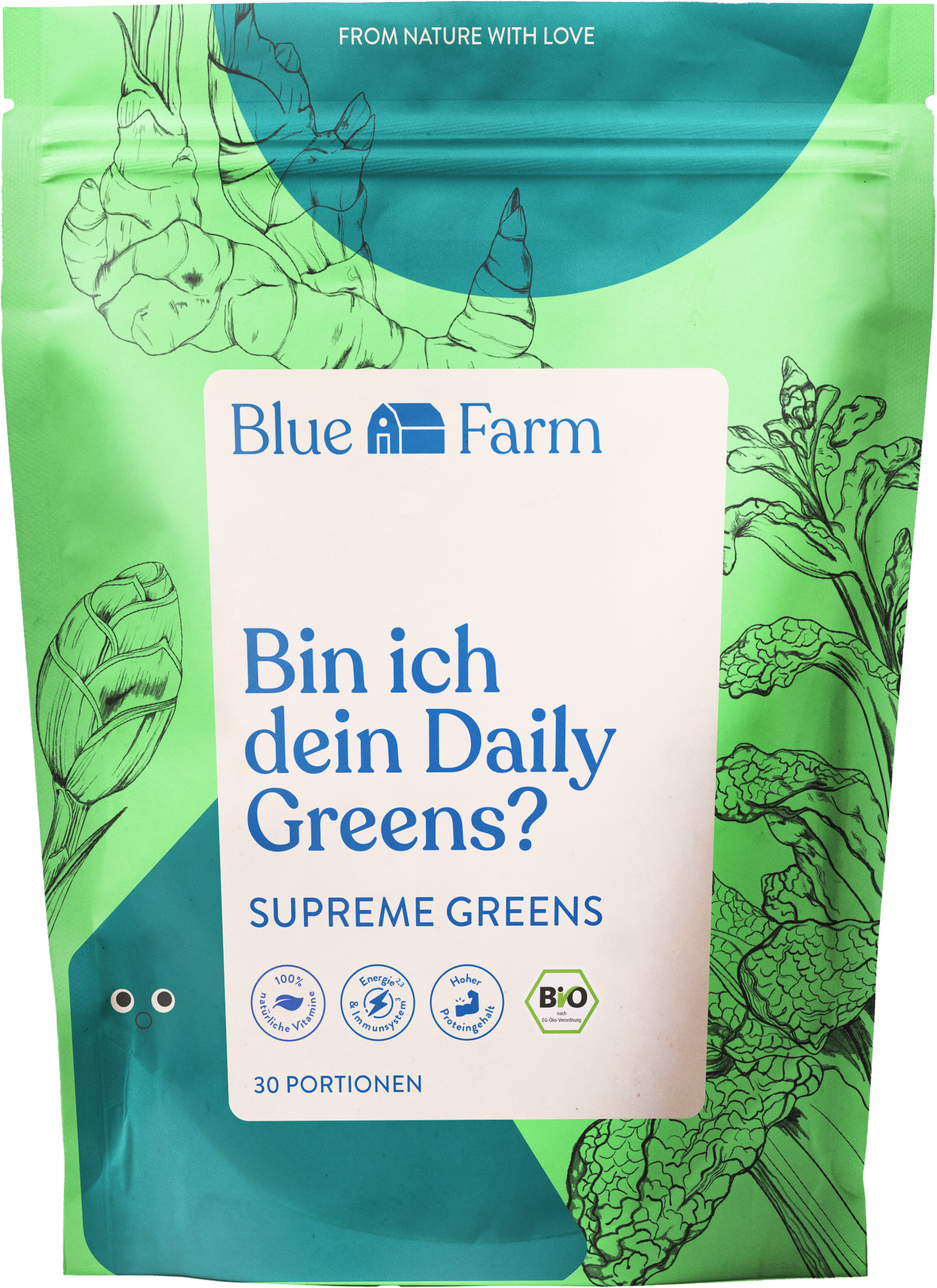 Supreme Greens napitek v prahu znamke Blue Farm je s hranili bogata mešanica bio sadja in zelenjave v prahu, alg, proteinov in adaptogenov iz zdravilnih gob. Prašek je brez dodanega sladkorja in je enostavna rešitev "vse v enem" za vaše vsakdanje življenje. Supreme Greens je enostaven za pripravo z vodo ali rastlinskim mlekom in je popoln za vse, ki imajo malo časa, vendar dajejo prednost vsestranskosti in kakovosti.