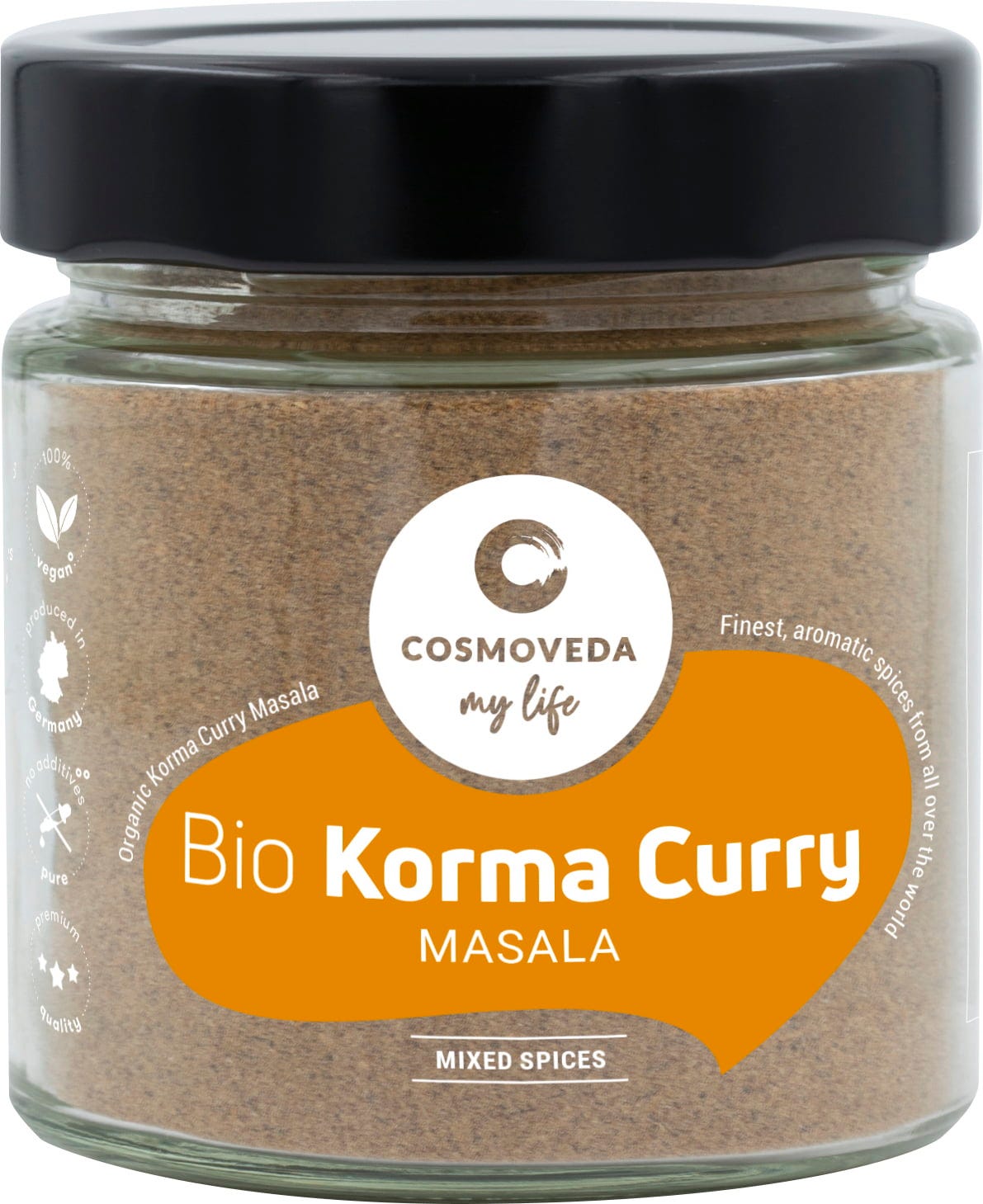COSMOVEDA BIO korma kari masala specialno uravnotežena ayurvedska mešanica skrbno izbranih začimb za okusno kormo.