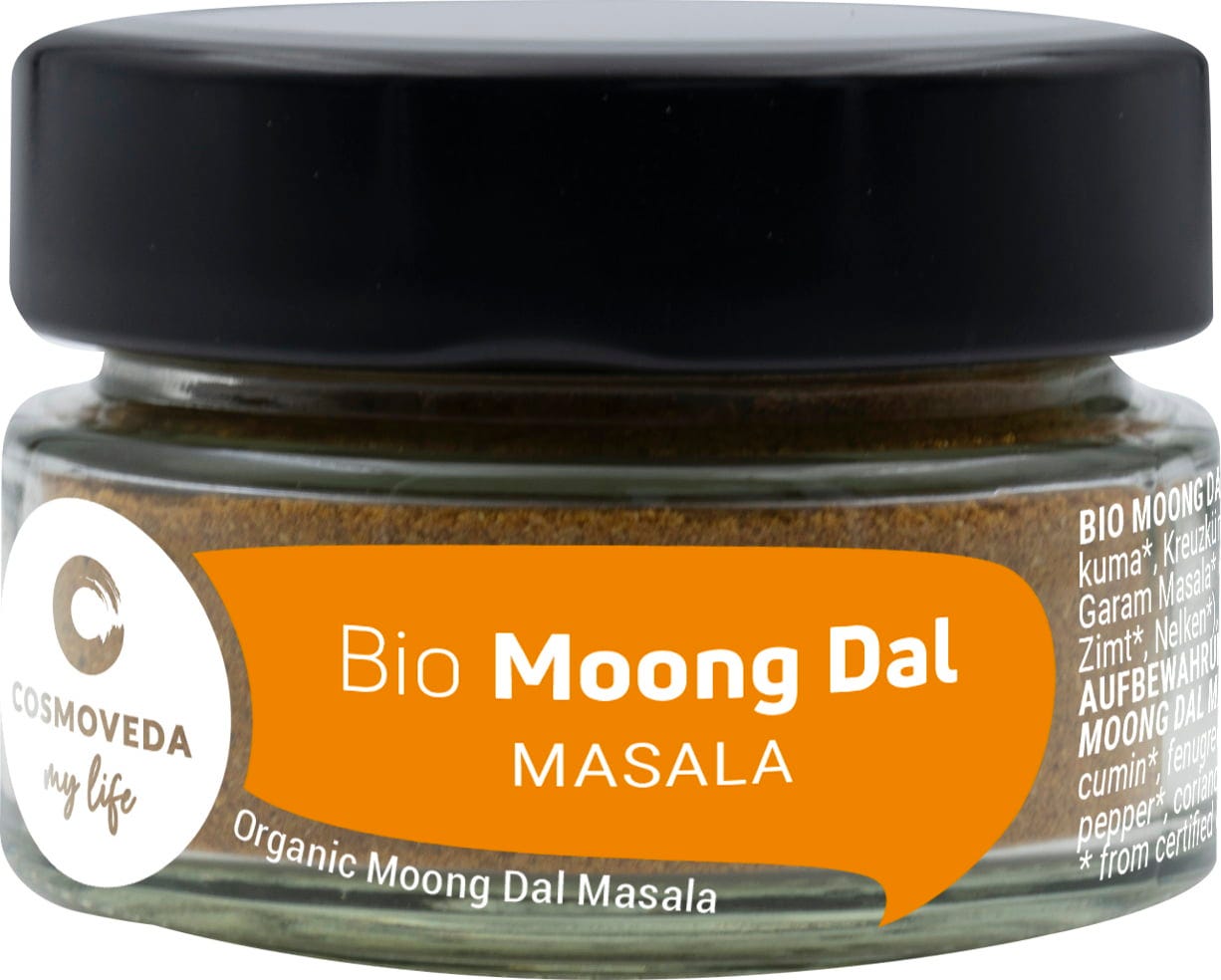 COSMOVEDA BIO moong dal masala, posebno naravna ayurvedska mešanica iz skrbno izbranih začimb za okusne moong dal jedi. Masala previdno, za kratek popečete v ghee-ju in dodajte na samem začetku ali med samim kuhanjem.