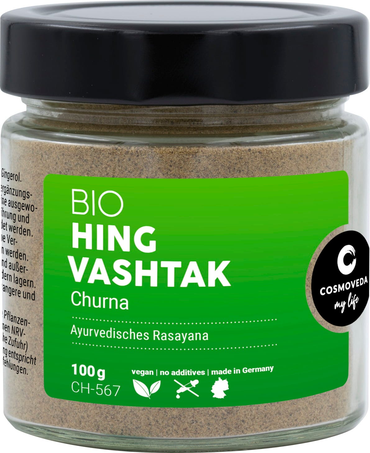 BIO Hingvashtak Churna je ajurvedski začimbni pripravek z ajvainom, ingverjem, črnim poprom, dolgim poprom, kumino, črno kumino, soljo, rakitovcem in asfoetido.