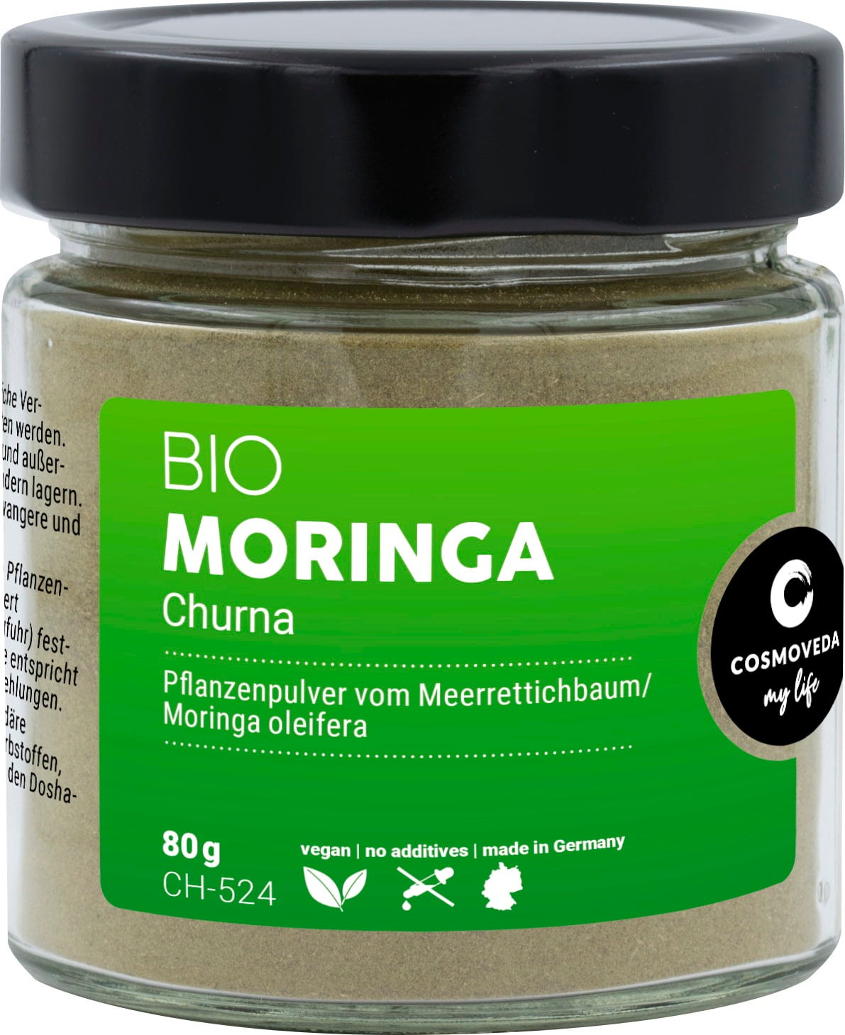 Listi, ki jih Cosmoveda uporablja za Moringa Churna BIO, izvirajo iz Moringa oleifera, imenovane tudi "hrenovo drevo", iz indijske in šrilanške sejemske trgovine in ekoloških projektov.