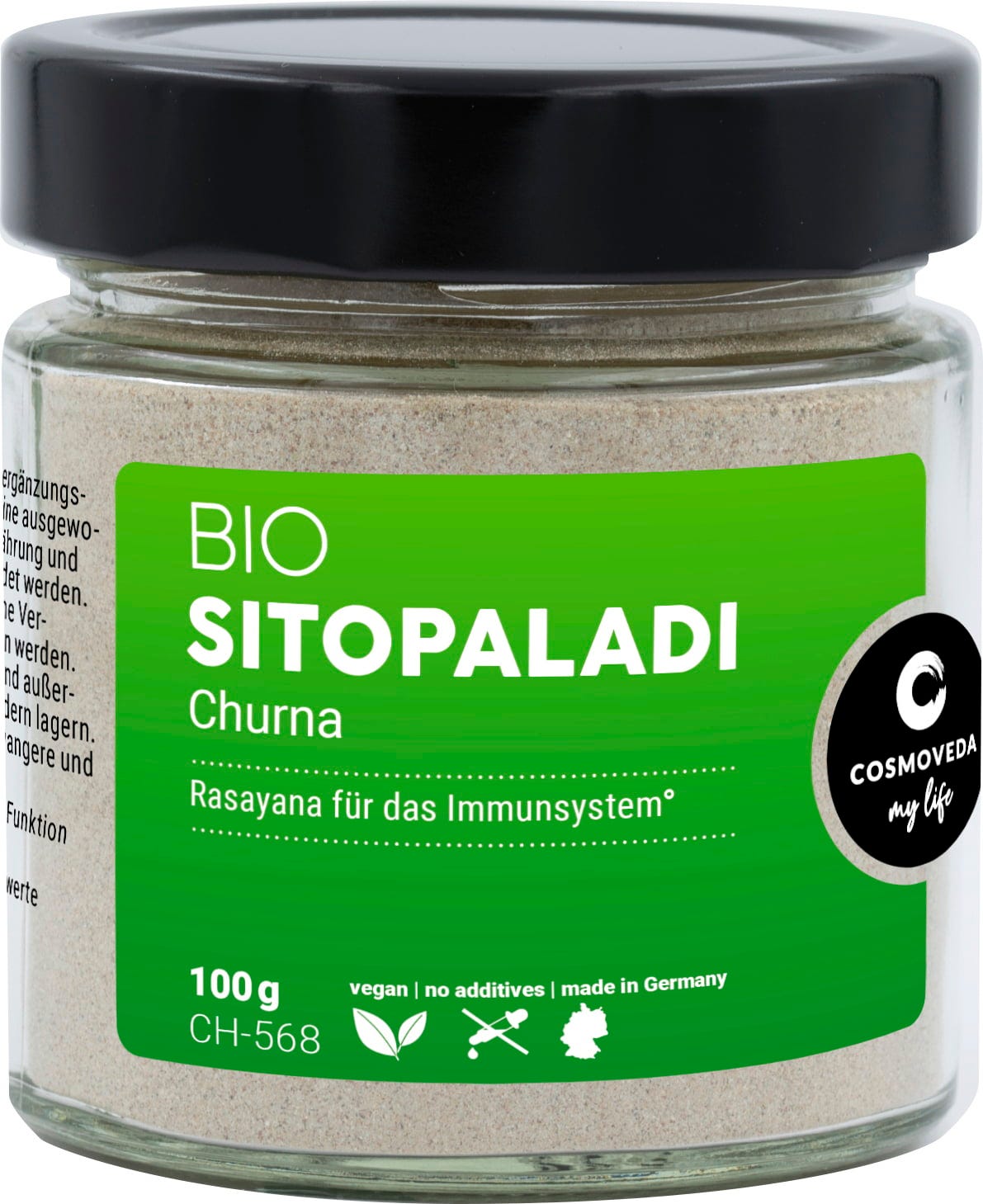 BIO Sitopaladi Churna iz Cosmoveda vsebuje ajurvedsko zeliščno mešanico pippali, kardamom, cimet, vamsalochana in surov trsni sladkor v ekološki kakovosti.