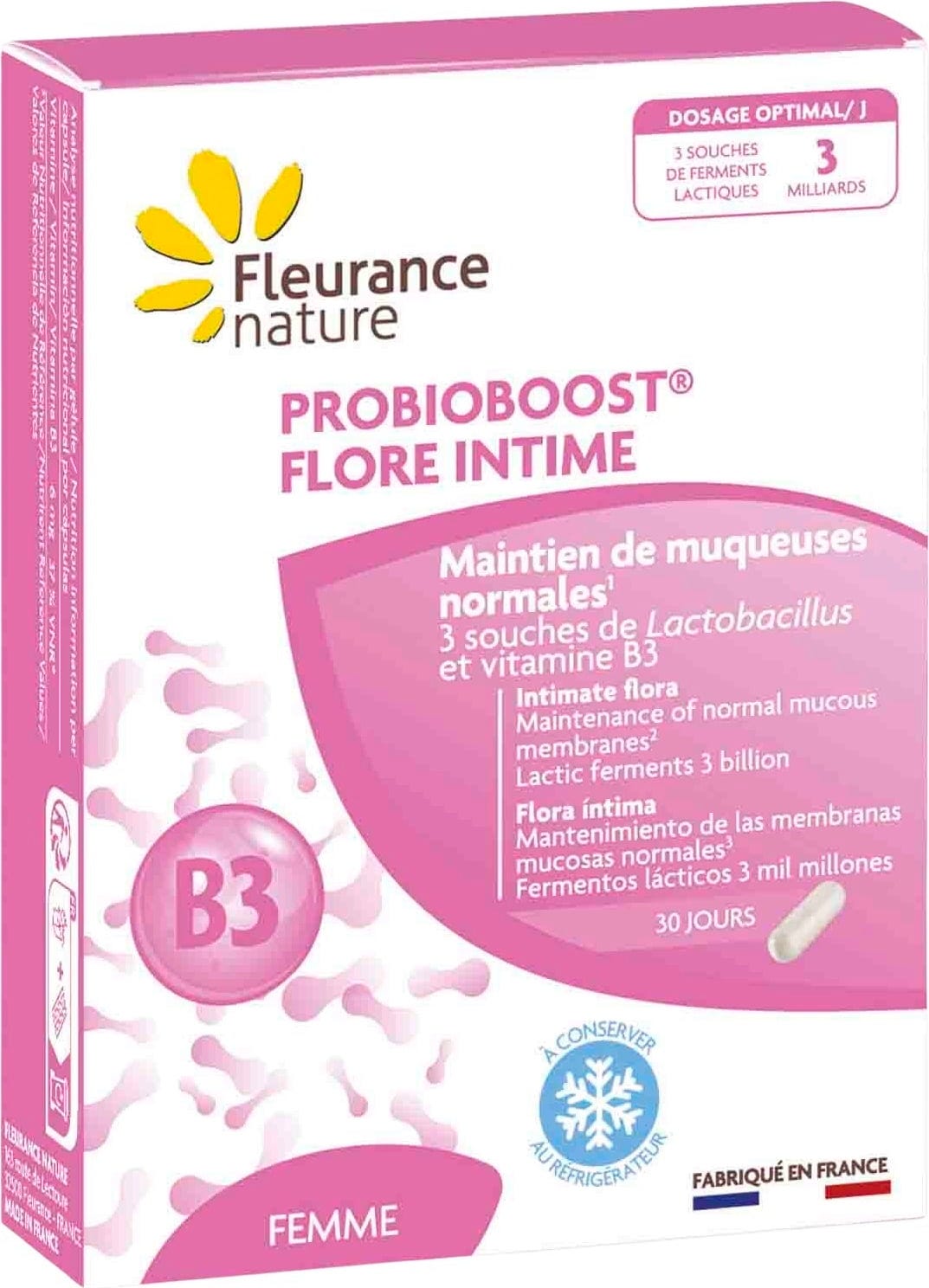 PROBIOBOOST® Intimate Flora vsebuje bakterijske seve Lactobacillus crispatus, Lactobacillus salivarius in Lactobacillus rhamnosus. Te so naravno prisotne v vaginalni flori. Formula je obogatena z vitaminom B3. Uporaba je enostavna, saj kapsule preprosto zaužijete peroralno. To zagotavlja približno 3 milijarde probiotikov na dan.