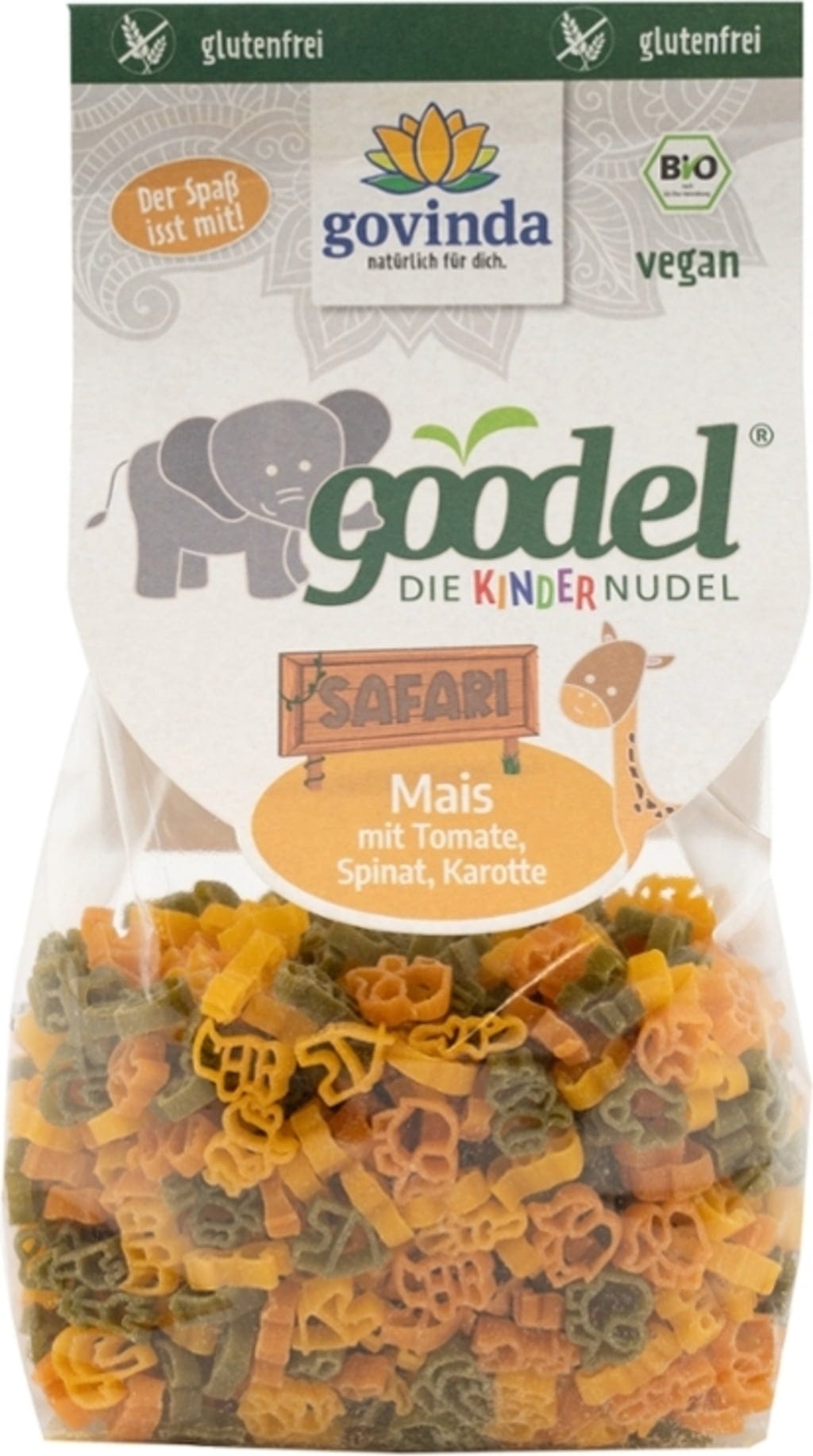 Kinder Goodel "Safari" testenine znamke Govinda ponujajo pisano zabavo v obliki afriških divjih živali. Izdelane so v italijanski manufakturni kakovosti, kjer je nežno koruzno testo naravno obogateno s paradižnikom, korenčkom in špinačo. Nežno sušene testenine ne vsebujejo glutena in se skuhajo perfektno "al dente". Barvita in zdrava izbira za otroške krožnike, pripravljena brez umetnih dodatkov.
