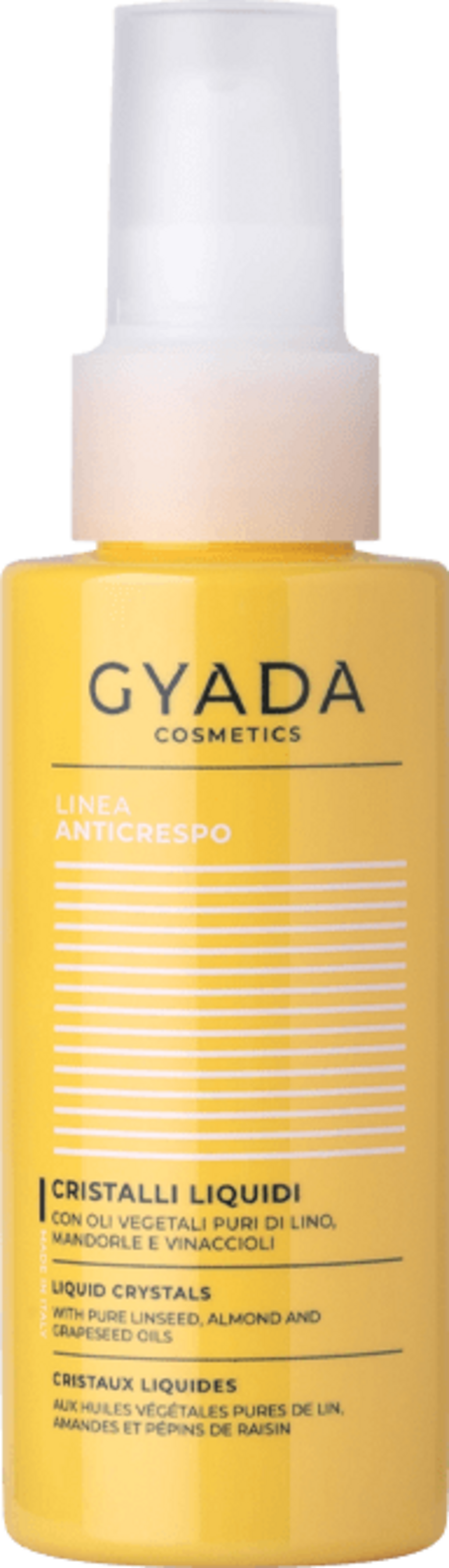 Tekoči kristali skupine GYADA Cosmetics pomagajo izboljšati lesk las in zaprejo razcepljene lase. Brezalkoholna, koncentrirana mešanica čistih rastlinskih olj (grozdnih pešk, mandljev in lana) je idealna za suho, krhke in motne lase. Nega zagotavlja svilen, sijaj in ščiti pred škodljivimi vplivi okolja, vročino iz sušilnikom las.