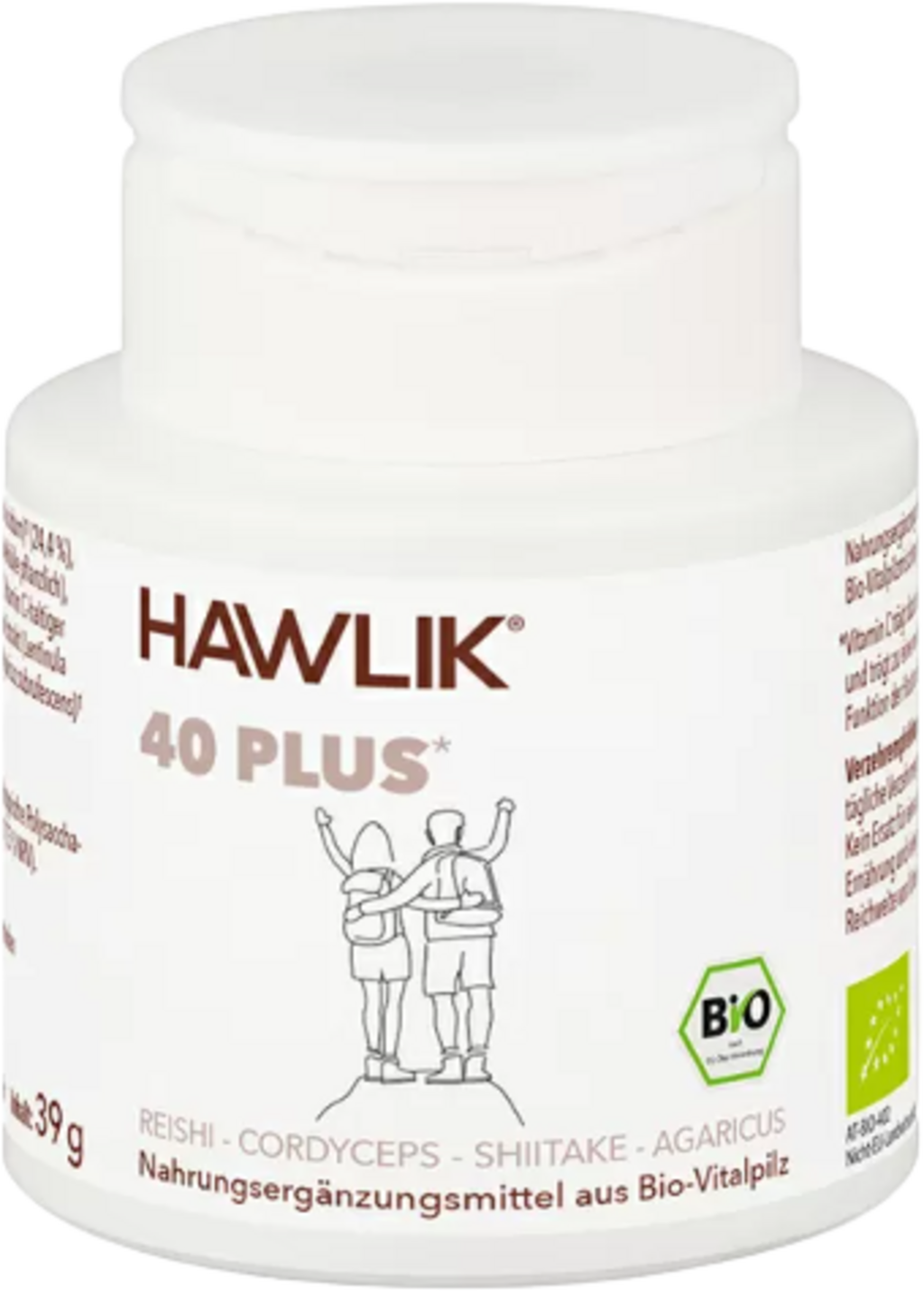 40 Plus mešanica vitalnih gob, znamke Hawlik vsebuje prah in izvlečke iz 4 različnih vitalnih gob: