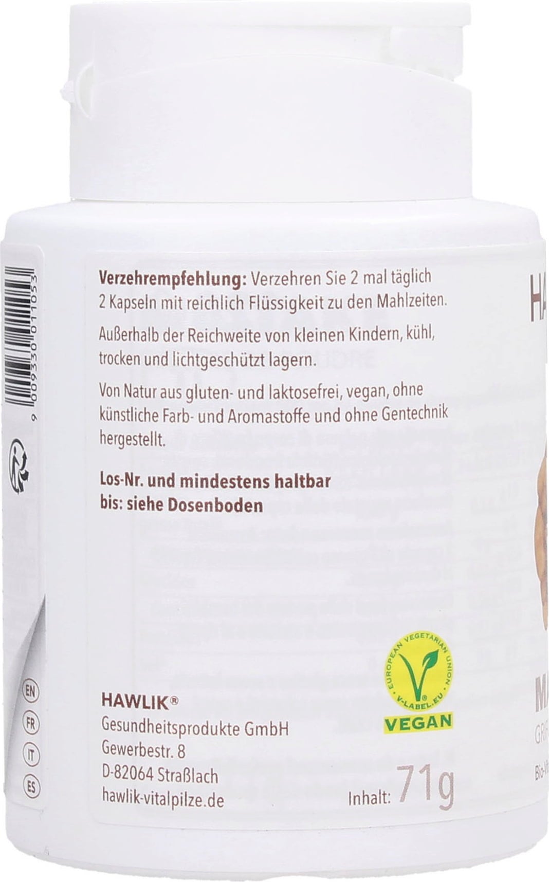 Prašek iz nežno posušene gobe Maitake je osnova teh kapsul. Vsebuje veliko vitaminov, mineralov in elementov v sledovih. Poleg tega so kapsule izključno rastlinske ter brez glutena in laktoze.