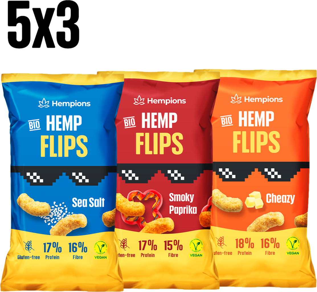 Hrustljav prigrizek iz 100 % naravnih bio sestavin. Flips prigrizek je narejen iz leče, koruze in konopljinih semen ter je bogat z beljakovinami in vlakninami. Vsebujejo tudi manj maščob kot primerljivi izdelki. Trije različni okusi zagotavljajo raznolikost prigrizkov.