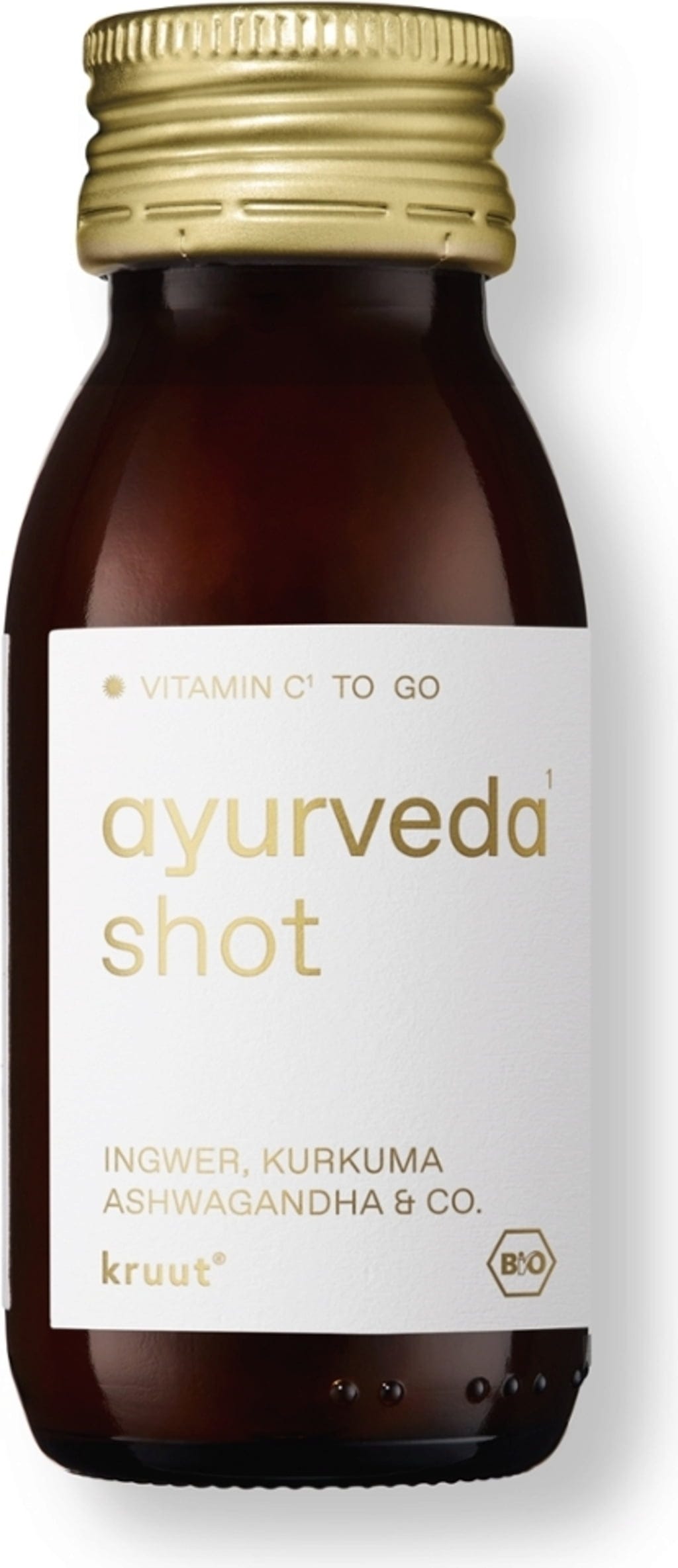 Ayurveda Shot znamke kruut družuje tradicionalni recept naravno motnega jabolčnega Demeter kisa in surovega cvetnega medu z regionalno kutino in tipičnimi ajurvedskimi zelišči. Tekoča sestava vsebuje izvlečke ingverja, kurkume, ašvagande, črnega popra, žafrana in kardamoma.