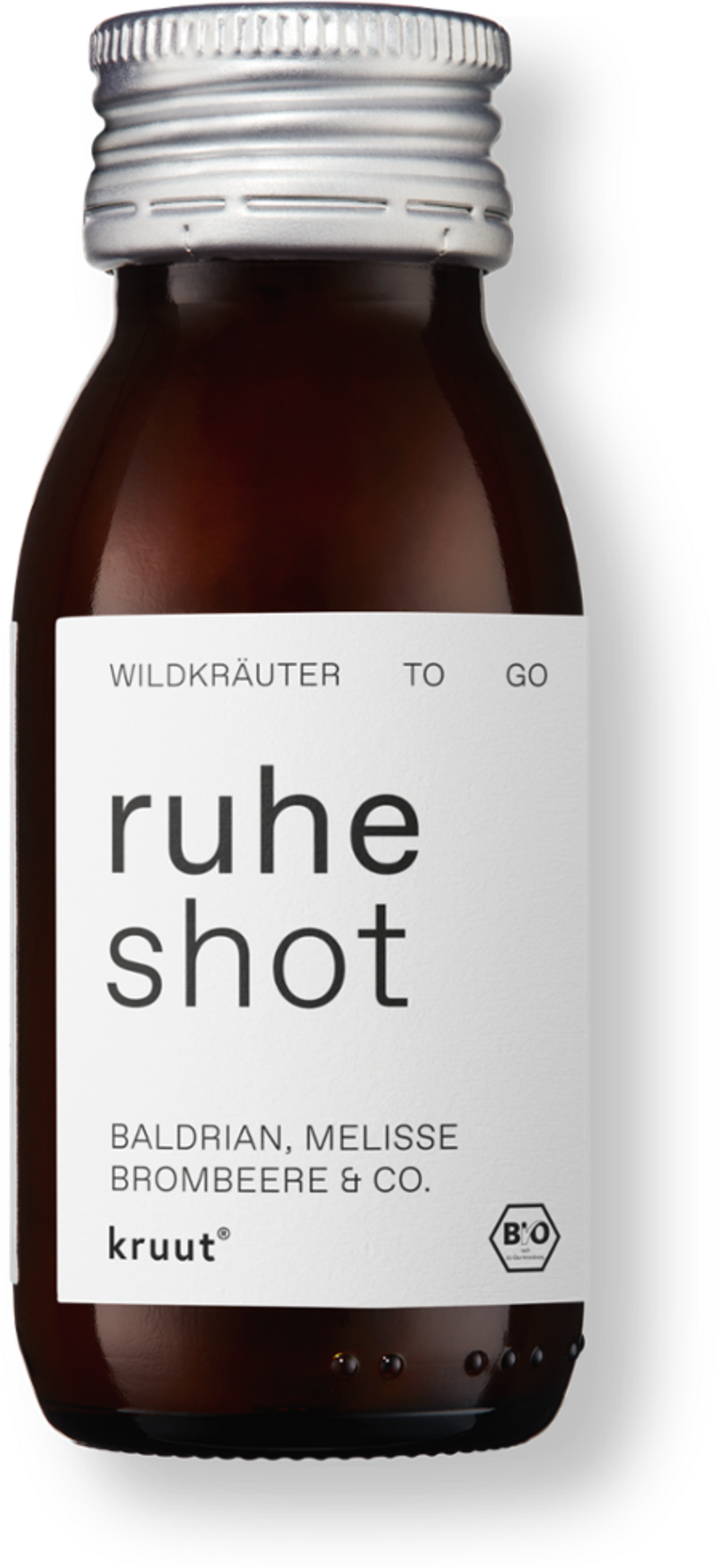 Ruhe Shot znamke kruut združuje tradicionalni recept naravno motnega jabolčnega Demeter kisa in surovega cvetličnega medu s sadnimi notami robide in izbranih rastlinskih izvlečkov. Sestava vsebuje izvlečke melise, ovsene trave, korenine baldrijana in mladih smrekovih vršičkov.