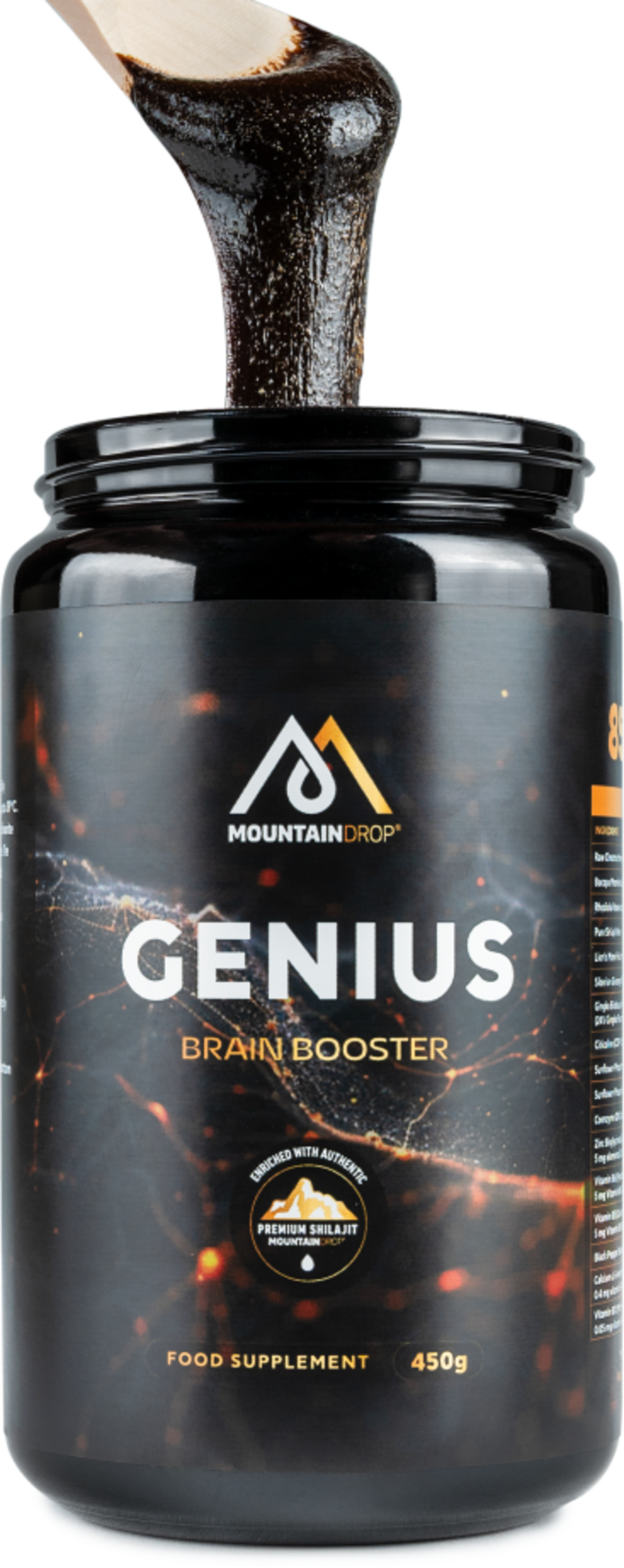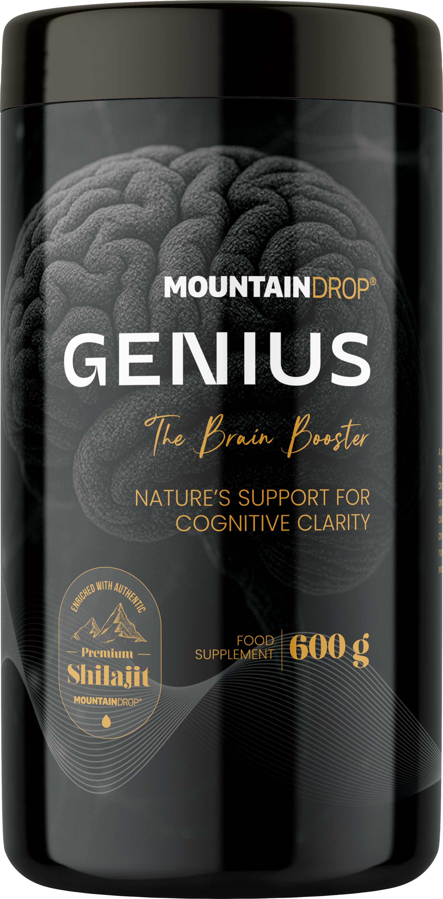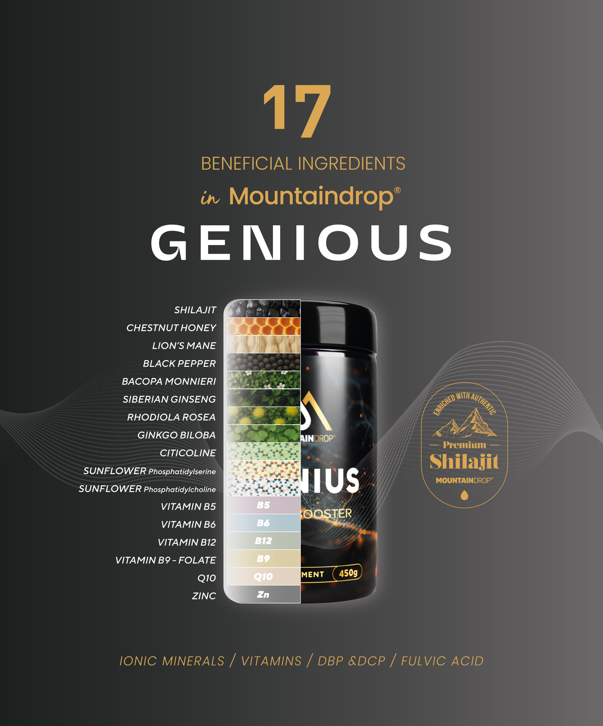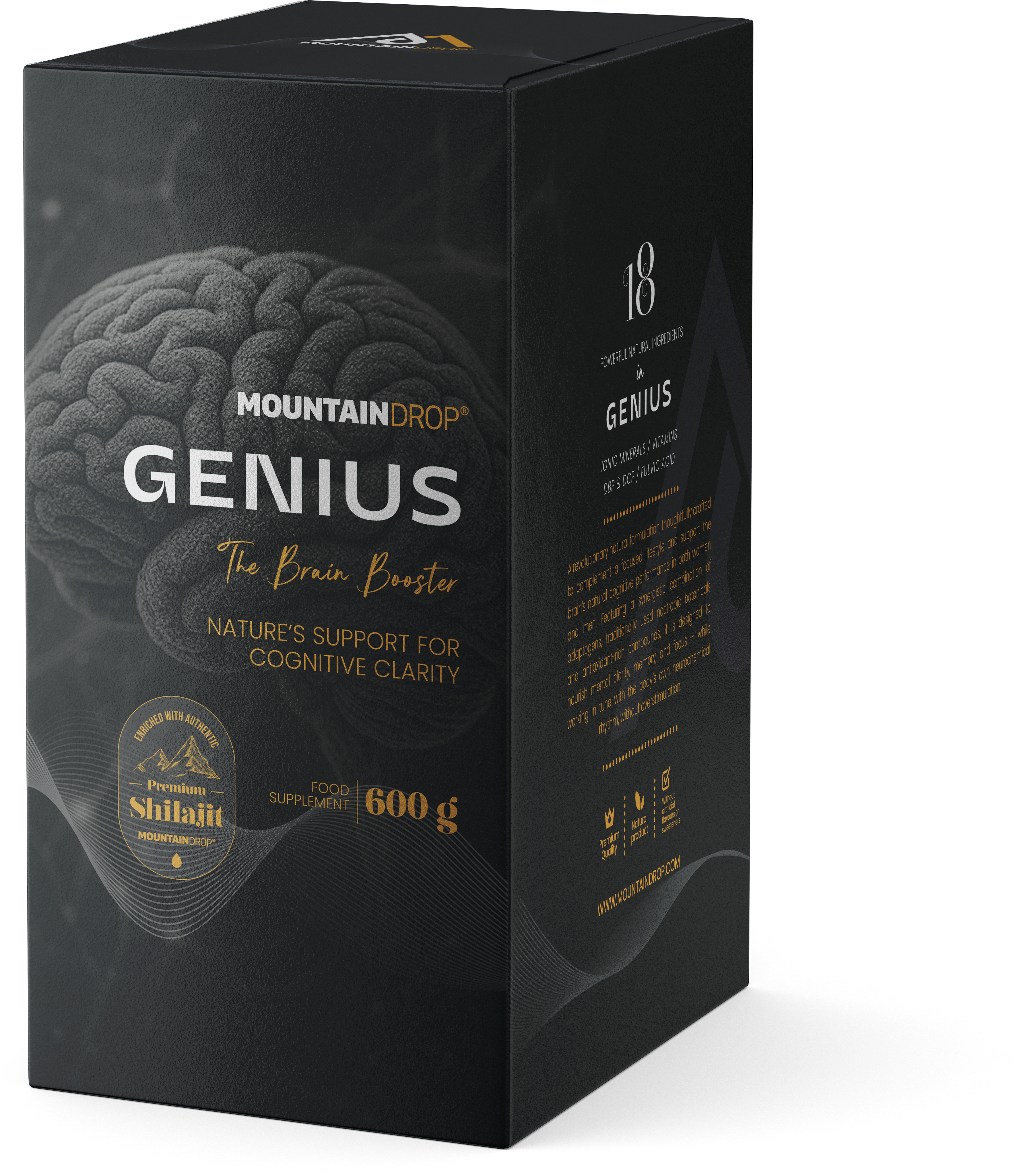 Genius znamke Mountaindrop temelji na s hranili bogatem vrhunskem šilajitu, ki mu je dodanih 16 izbranih sestavin. Formula združuje tradicionalno cenjene rastlinske izvlečke s fosfolipidi, koencimom Q10, usklajenim kompleksom vitaminov B in cinkom. Črni poper optimizira biološko uporabnost. Vsako serijo tega slovenskega kakovostnega izdelka neodvisni laboratoriji preverijo glede čistosti in ostankov.