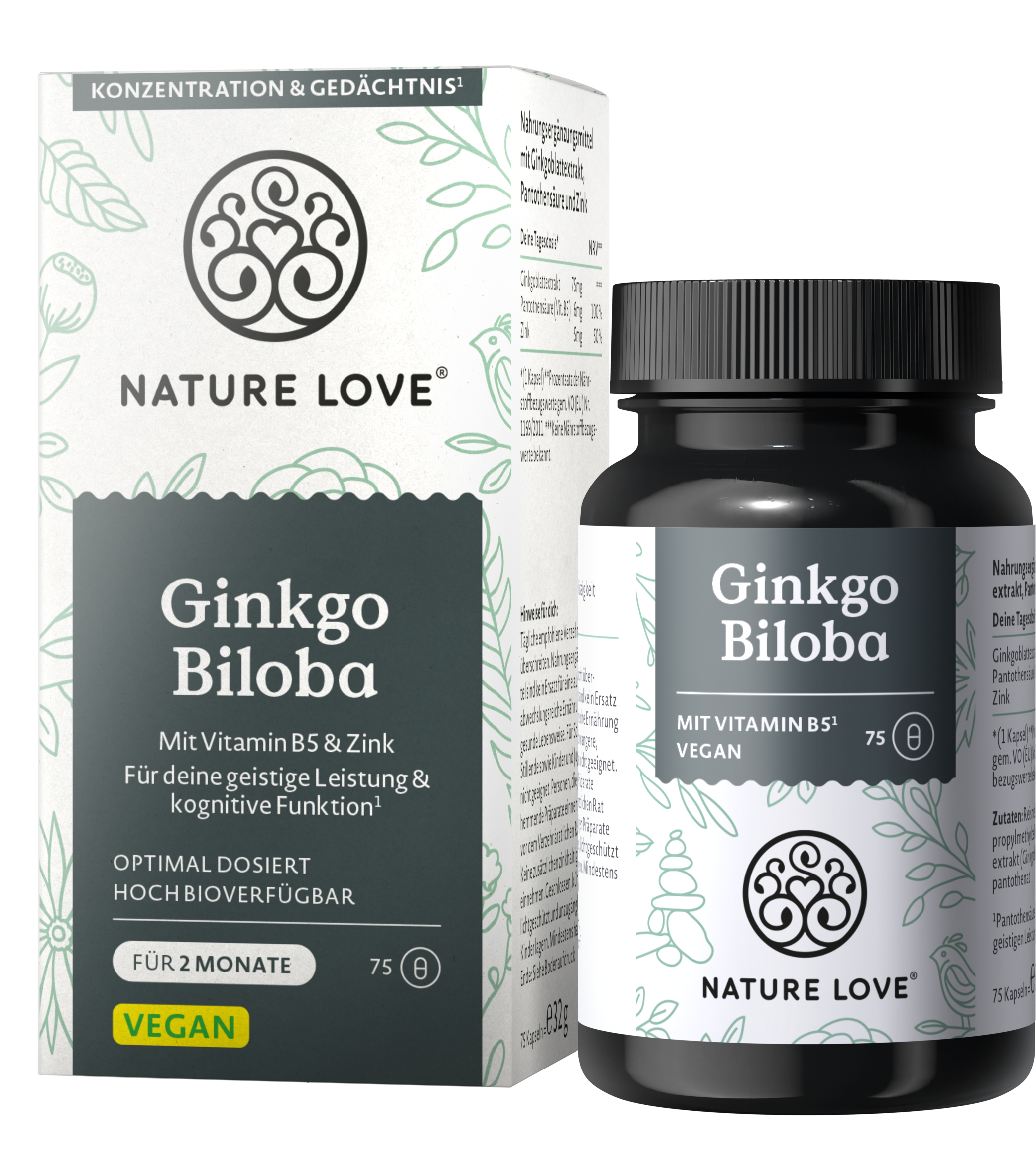 Kapsule Ginkgo Biloba znamke Nature Love vsebujejo visokokakovosten, optimalno odmerjen izvleček listov ginka. Kapsule so obogatene tudi z vitaminom B5 in cinkom. So 100 % veganske, brez glutena in laktoze.