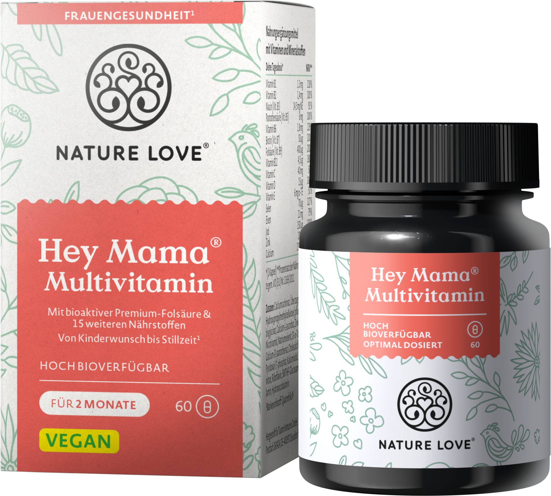 Multivitaminske kapsule Hey Mama znamke Nature Love vas podpirajo že od trenutka, ko poskušate zanositi do obdobja dojenja. Kapsule so obogatene s številnimi visokokakovostnimi hranili, ki zagotavljajo optimalno podporo v tem vznemirljivem obdobju. Nature Love med drugim združuje vrhunsko folno kislino, jod, cink, vitamin B6, vitamin B12 in železo. Kapsule so veganske in optimalno dozirane.