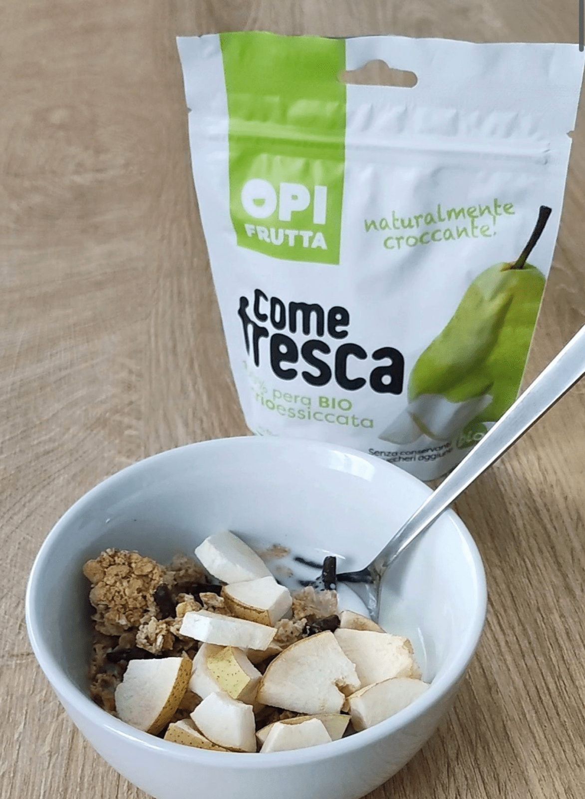 Te liofilizirane bio hruške prihajajo iz regije Modena. Ponašajo se z nežno teksturo, naravno sladkostjo in visoko vsebnostjo vlaknin – idealne so za zdravo prehrano s polnim okusom.