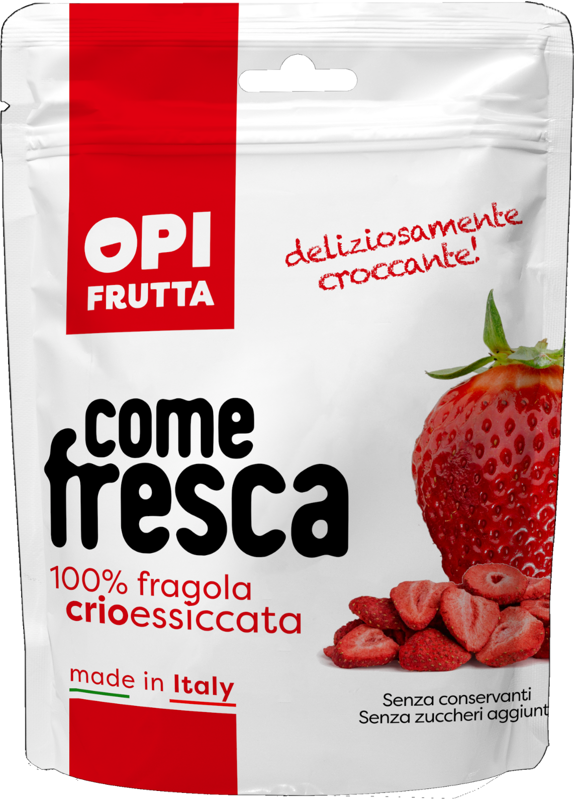 Liofilizirane jagode OPI FRUTTA ponujajo intenziven sadni okus v hrustljavi obliki. Ponašajo se z naravno vsebnostjo vitamina C – idealne so kot prigrizek ali dodatek k jogurtu, muesliju in sladicam.