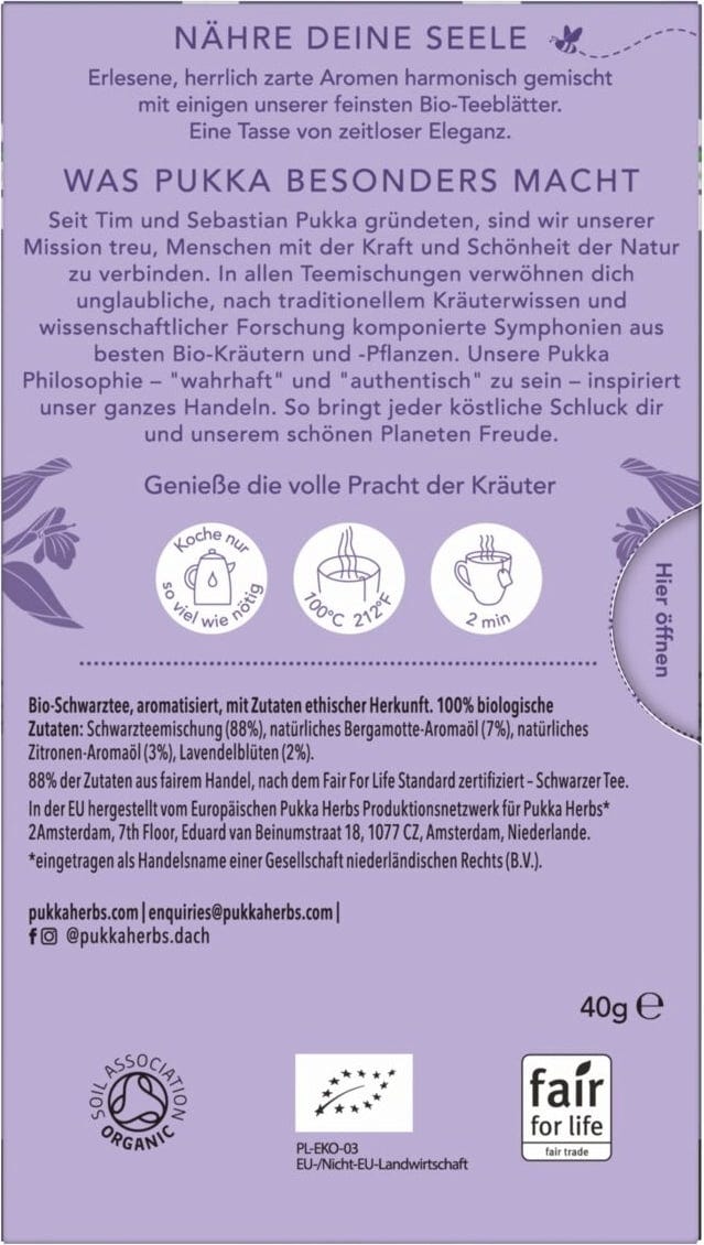 | Odgovorni nosilec živilske dejavnosti: | Lipton Teas and Infusions Germany GmbH, Axel-Springer-Platz 3, c/o WeWork, 20355, Hamburg, Nemčija, kontakt@pukkaherbs.de |