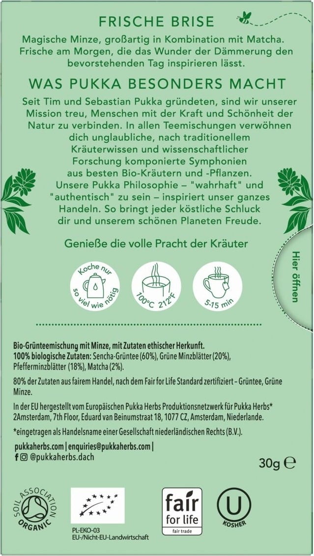 Ta edinstveni zeleni čaj, ki so ga oblikovali strokovnjaki za zelišča in nutricionisti znamke PUKKA, združuje najnovejša znanstvena dognanja s tradicionalnim znanjem o zeliščih. Rezultat je sinergistična kombinacija bio mete, poprove mete, zelenega čaja sencha in matche, ki ustvarja uravnoteženo skodelico s hladilnimi aromami in subtilnimi, bogatimi notami. Za čudovito skodelico čaja, polno poživljajočega okusa.