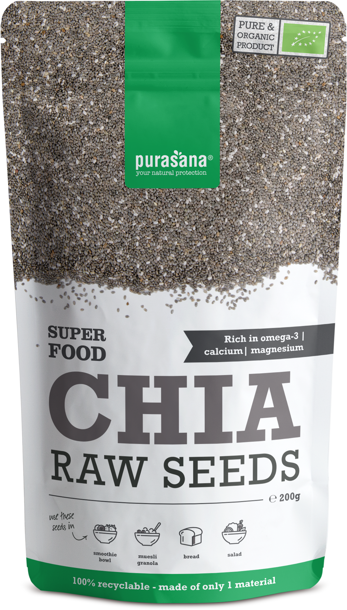 Chia rastlina je doma v Južni Ameriki in semena so pomembna hrana že stoletja. Imajo optimalno ravnovesje številnih hranil in fitokemikalij. Bio Chia semenih iz skupine Purasana so nepredelana in brez dodatkov.