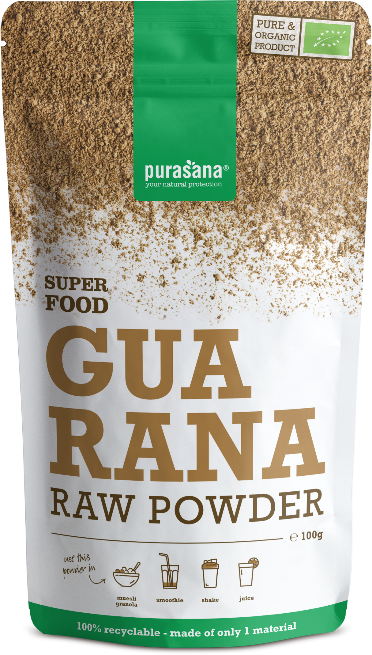 Guarana, Paullinia cupana, je plezalec v Amazoniji. V Purasana Bio-guarana v prahu so zmleta semena in plodovi. Guarana vsebuje kofein že po naravni poti, kar pomeni, da telo počasneje absorbira kofein, v nasprotju s kavo. Prednostv je, da deluje kofein bolj enotno in dlje časa.