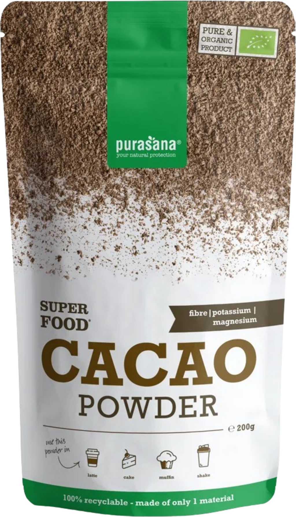 Kakav v prahu znamke Purasana je pridobljen brez segrevanja iz semen "Theobroma cacao", majhnega drevesa, ki raste v tropskem podnebju. Čisti kakav v prahu naravno vsebuje veliko posebnih hranil in sekundarnih rastlinskih snovi.