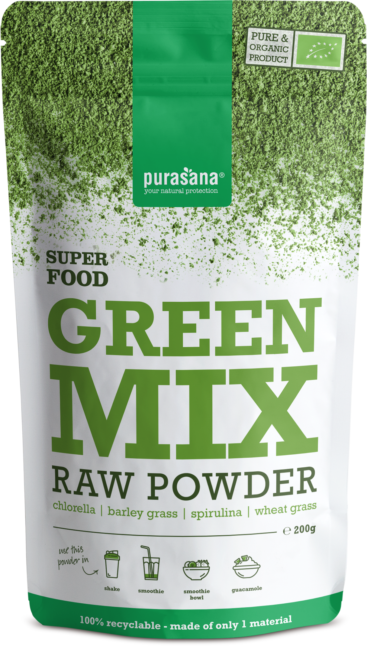 Bio Green Mix znamke Purasana je zelena mešanica presnih surovin iz klorele, spiruline, pšenične trave in ječmenove trave. Je naravni vir rastlinskih hranil, ki jih telo zlahka absorbira.