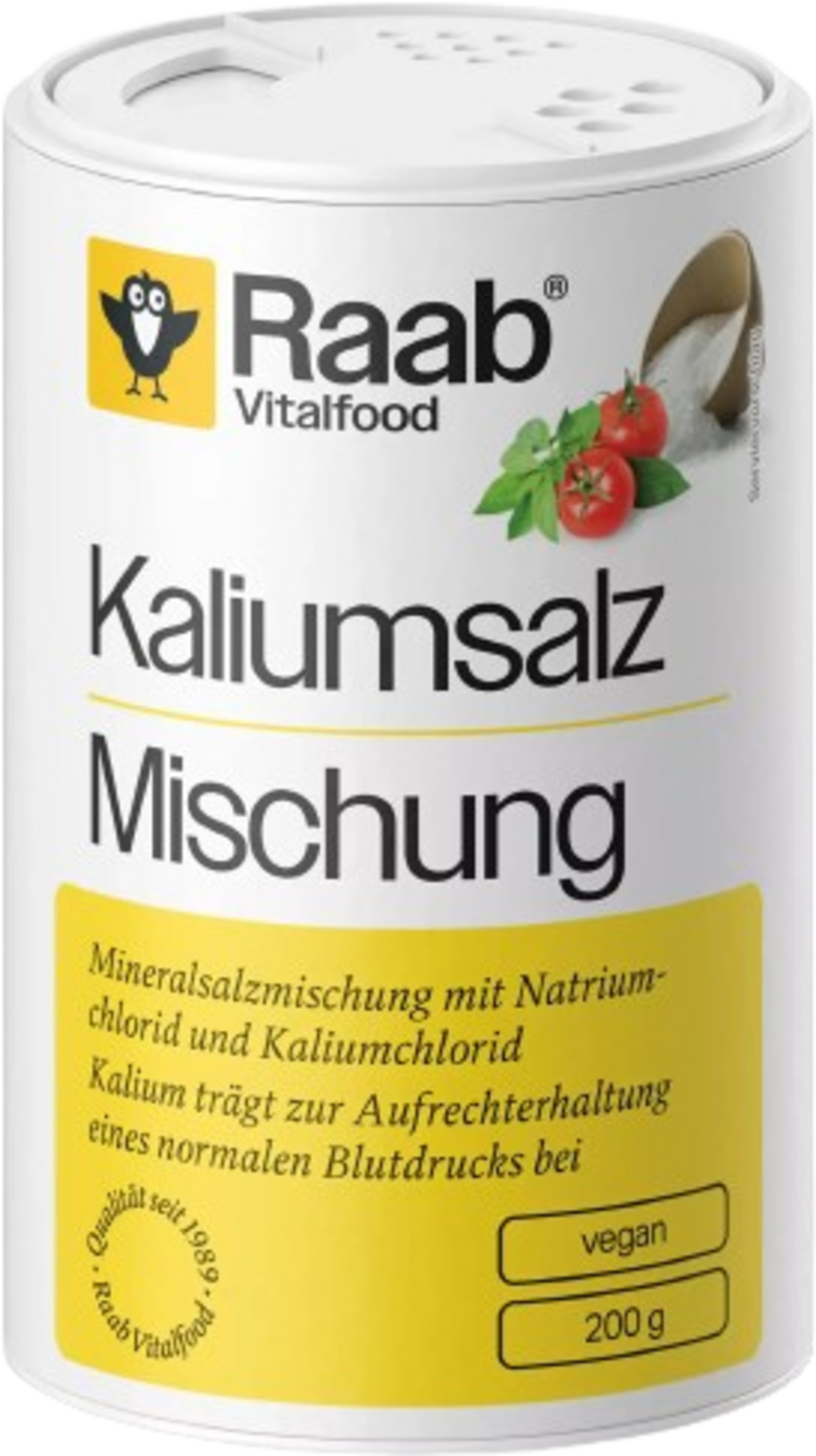 Mešanica kalijeve soli znamke Raab Vitalfood vsebuje mešanico mineralne soli s 66,7 % kuhinjske soli (natrijev klorid) in 33 % kalijevega klorida. Je popolna alternativa običajni kuhinjski soli in se lahko uporablja v vseh živilih in jedeh.