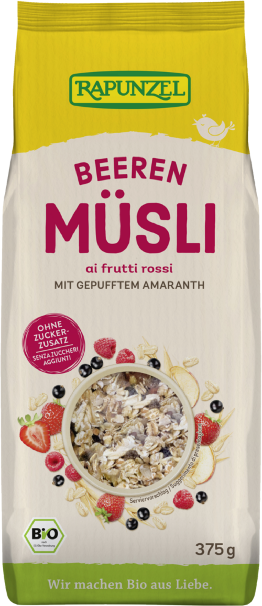 Pražen, ekspandiran amarant iz Avstrije, drobni koščki jabolk in mešanica jagodičevja - sadni in aromatični zajtrk! Seveda ne smejo manjkati nasitni ovseni in pšenični kosmiči, tako da bo vaš jutranji začetek tudi hranilno bogat. Rapunzelov ekološki alpski amarantov muesli je okusen z vročim in hladnim mlekom, zelenjavnimi napitki in jogurtom.
