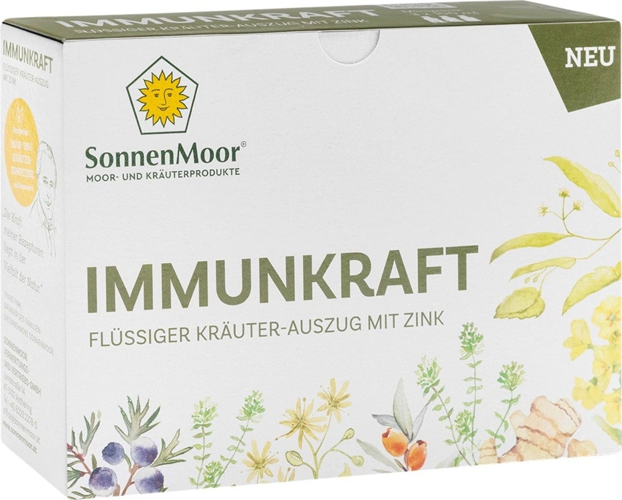 Immunkraft znamke SonnenMoor je izključno zeliščni izdelek, ki združuje dvanajst skrbno izbranih zelišč, jagod in korenin v tekoči obliki. Formula temelji na tradicionalno cenjenih rastlinah, kot so lipovi cvetovi, timijan, šipek in bezeg. Mešanico dopolnjujejo dragocene korenine ingverja in kurkume ter mineral cink.
